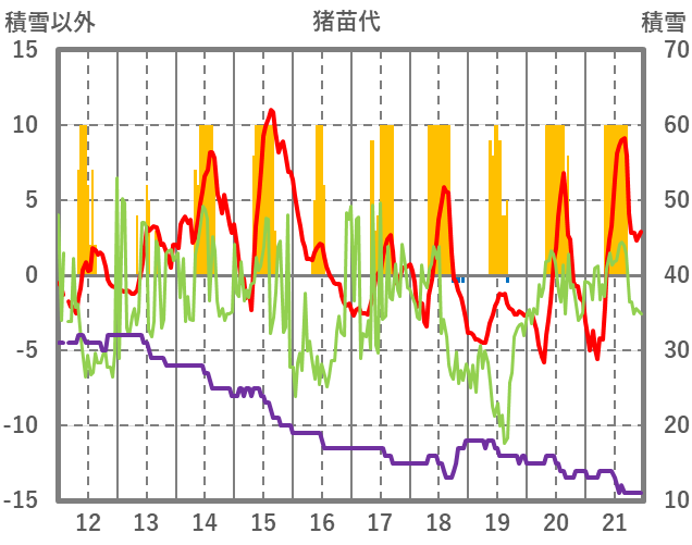 | 日 | 時 | 気温 | 降水 | 風向/風速 | 日照 | 積雪 | 降雪 |
