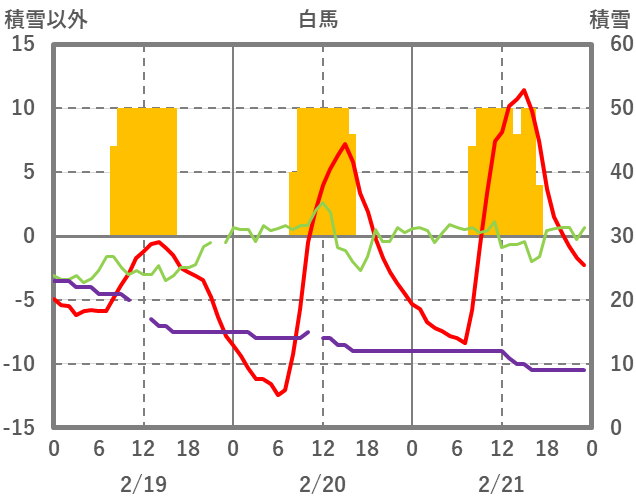 | 日 | 時 | 気温 | 降水 | 風向/風速 | 日照 | 積雪 | 降雪 |