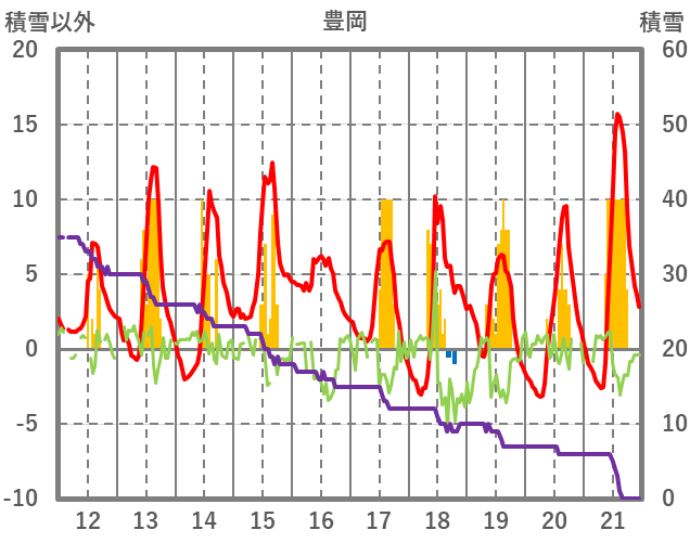 | 日 | 時 | 気温 | 降水 | 風向/風速 | 日照 | 積雪 | 降雪 |