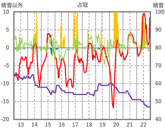 | 日 | 時 | 気温 | 降水 | 風向/風速 | 日照 | 積雪 | 降雪 |