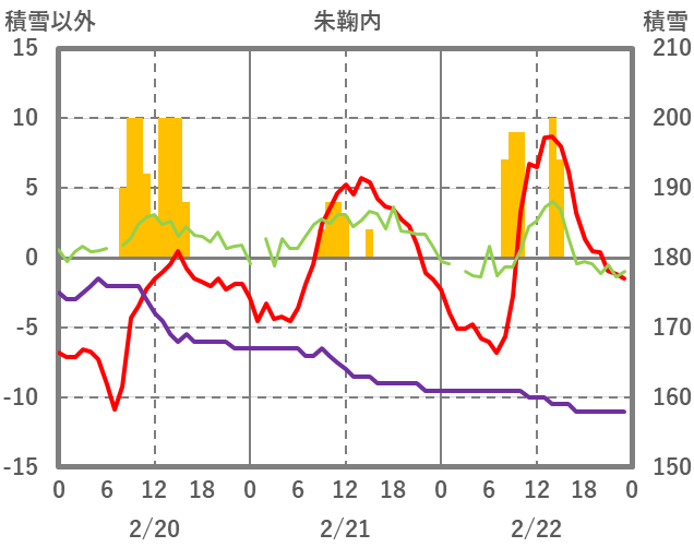 | 日 | 時 | 気温 | 降水 | 風向/風速 | 日照 | 積雪 | 降雪 |