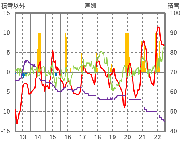 | 日 | 時 | 気温 | 降水 | 風向/風速 | 日照 | 積雪 | 降雪 |