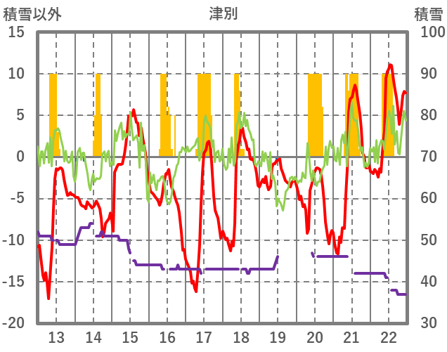 | 日 | 時 | 気温 | 降水 | 風向/風速 | 日照 | 積雪 | 降雪 |