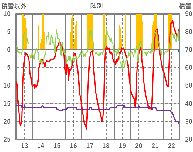 | 日 | 時 | 気温 | 降水 | 風向/風速 | 日照 | 積雪 | 降雪 |