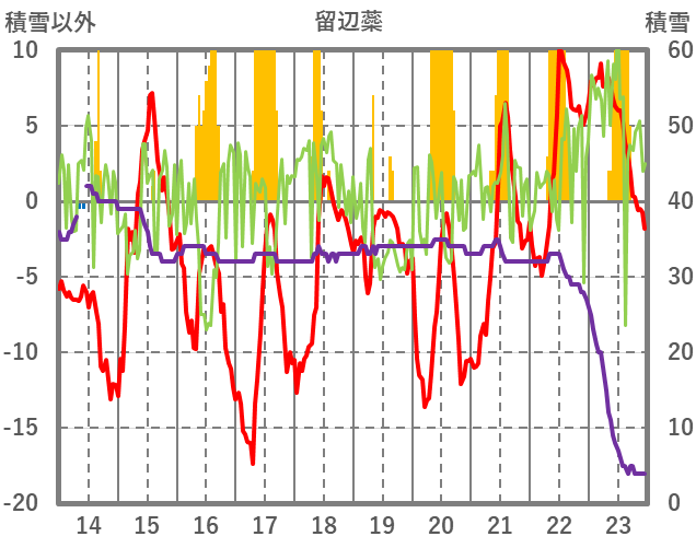 | 日 | 時 | 気温 | 降水 | 風向/風速 | 日照 | 積雪 | 降雪 |