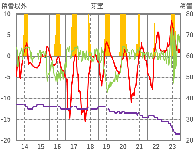 | 日 | 時 | 気温 | 降水 | 風向/風速 | 日照 | 積雪 | 降雪 |
