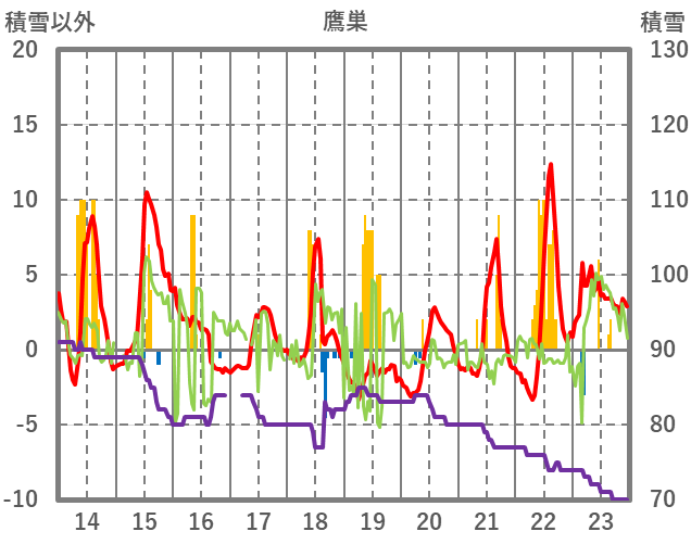 | 日 | 時 | 気温 | 降水 | 風向/風速 | 日照 | 積雪 | 降雪 |