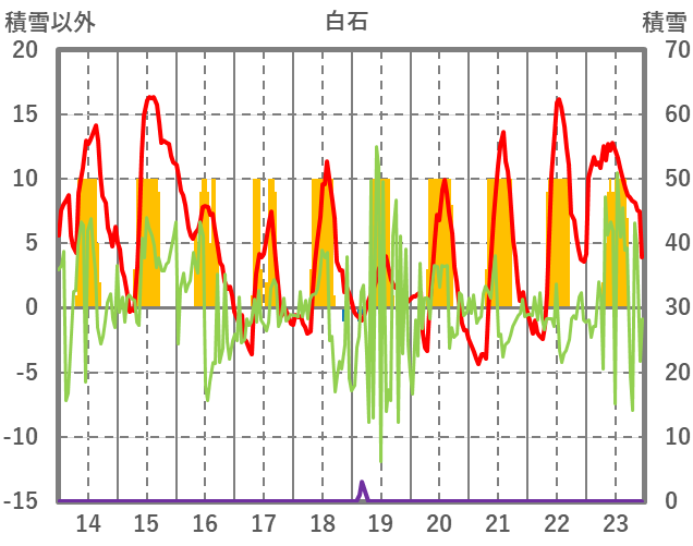 | 日 | 時 | 気温 | 降水 | 風向/風速 | 日照 | 積雪 | 降雪 |