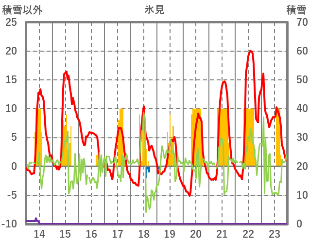 | 日 | 時 | 気温 | 降水 | 風向/風速 | 日照 | 積雪 | 降雪 |