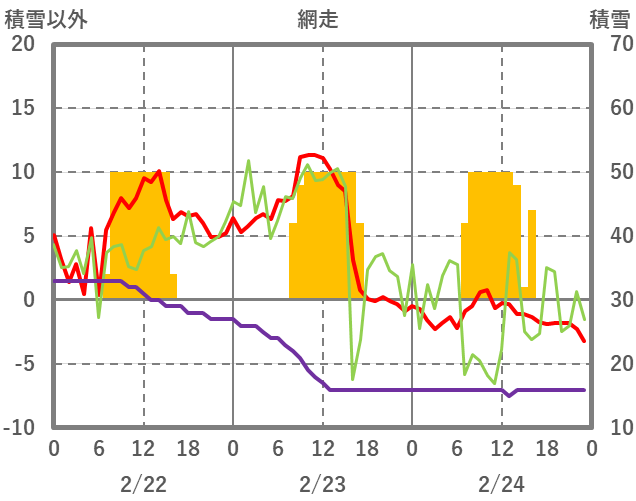 | 日 | 時 | 気温 | 降水 | 風向/風速 | 日照 | 積雪 | 降雪 |