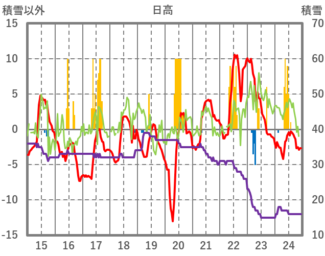 | 日 | 時 | 気温 | 降水 | 風向/風速 | 日照 | 積雪 | 降雪 |