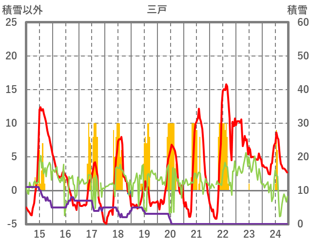 | 日 | 時 | 気温 | 降水 | 風向/風速 | 日照 | 積雪 | 降雪 |