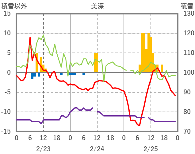 | 日 | 時 | 気温 | 降水 | 風向/風速 | 日照 | 積雪 | 降雪 |