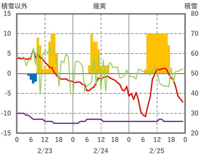 | 日 | 時 | 気温 | 降水 | 風向/風速 | 日照 | 積雪 | 降雪 |