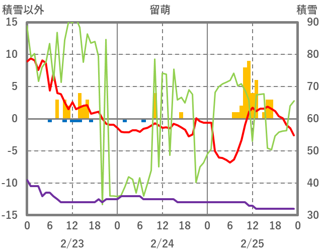| 日 | 時 | 気温 | 降水 | 風向/風速 | 日照 | 積雪 | 降雪 |