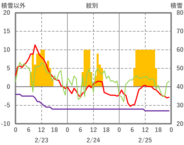 | 日 | 時 | 気温 | 降水 | 風向/風速 | 日照 | 積雪 | 降雪 |