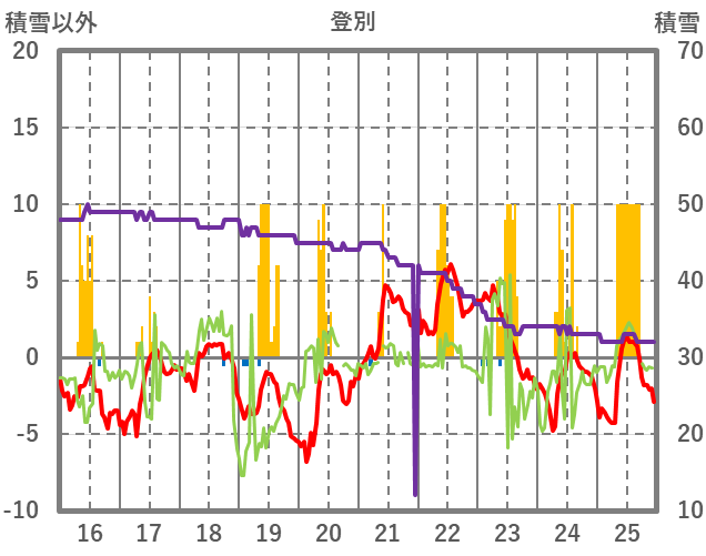 | 日 | 時 | 気温 | 降水 | 風向/風速 | 日照 | 積雪 | 降雪 |