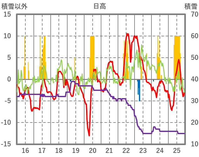| 日 | 時 | 気温 | 降水 | 風向/風速 | 日照 | 積雪 | 降雪 |