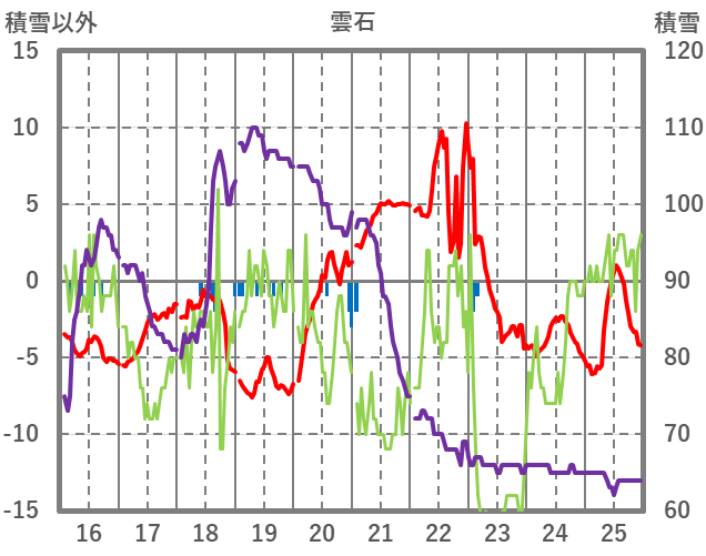 | 日 | 時 | 気温 | 降水 | 風向/風速 | 日照 | 積雪 | 降雪 |