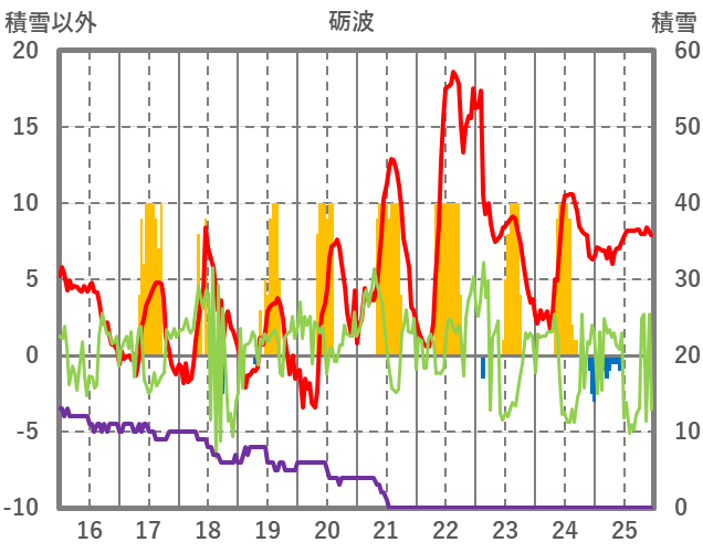 | 日 | 時 | 気温 | 降水 | 風向/風速 | 日照 | 積雪 | 降雪 |