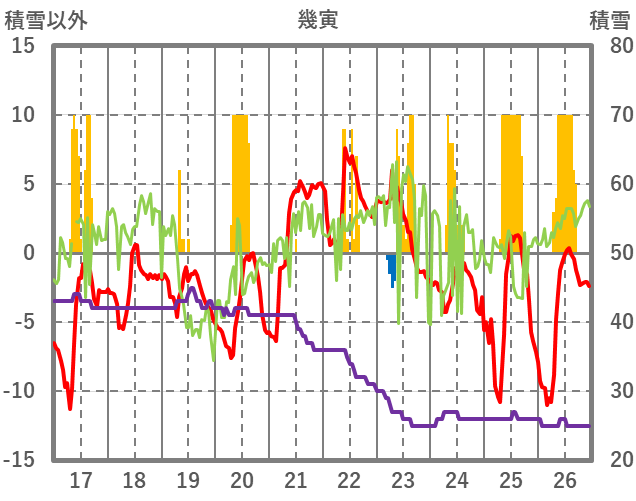 | 日 | 時 | 気温 | 降水 | 風向/風速 | 日照 | 積雪 | 降雪 |