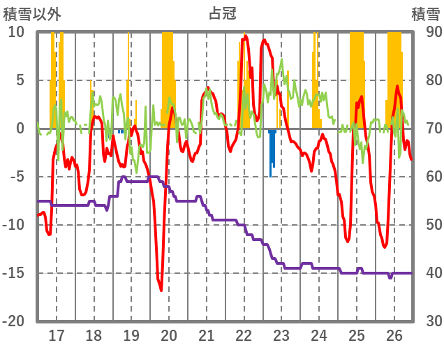| 日 | 時 | 気温 | 降水 | 風向/風速 | 日照 | 積雪 | 降雪 |