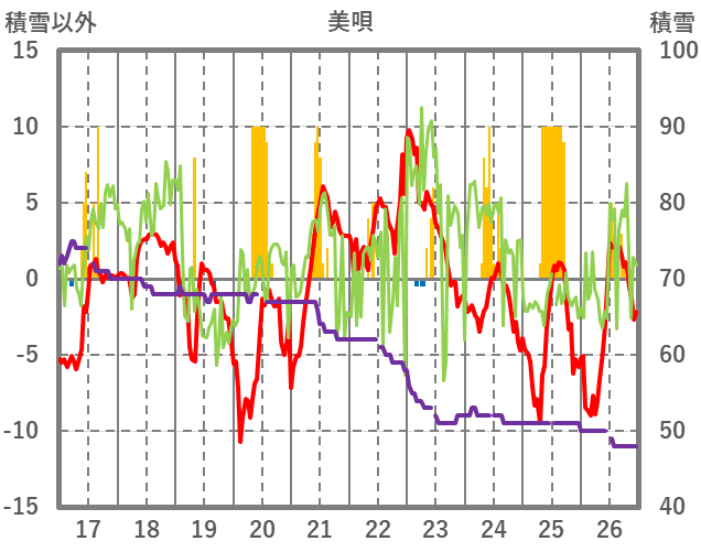 | 日 | 時 | 気温 | 降水 | 風向/風速 | 日照 | 積雪 | 降雪 |