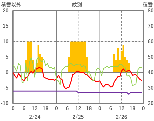 | 日 | 時 | 気温 | 降水 | 風向/風速 | 日照 | 積雪 | 降雪 |
