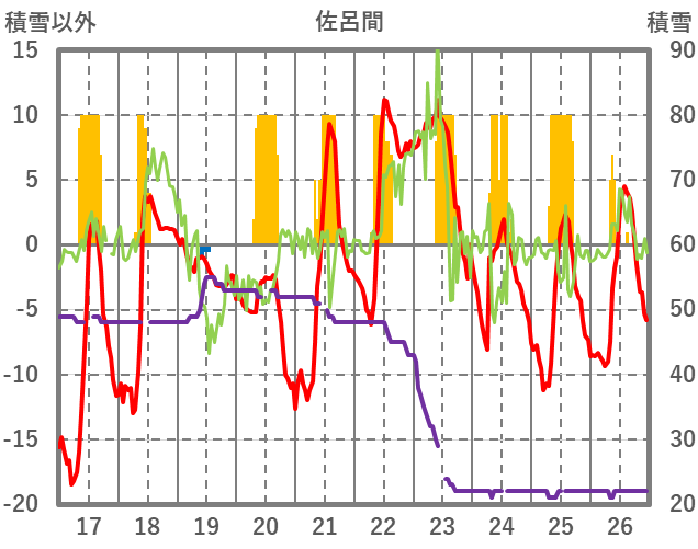 | 日 | 時 | 気温 | 降水 | 風向/風速 | 日照 | 積雪 | 降雪 |