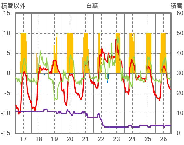 | 日 | 時 | 気温 | 降水 | 風向/風速 | 日照 | 積雪 | 降雪 |