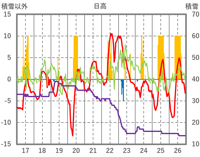 | 日 | 時 | 気温 | 降水 | 風向/風速 | 日照 | 積雪 | 降雪 |