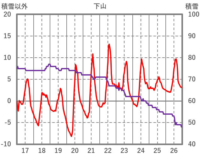 | 日 | 時 | 気温 | 降水 | 風向/風速 | 日照 | 積雪 | 降雪 |