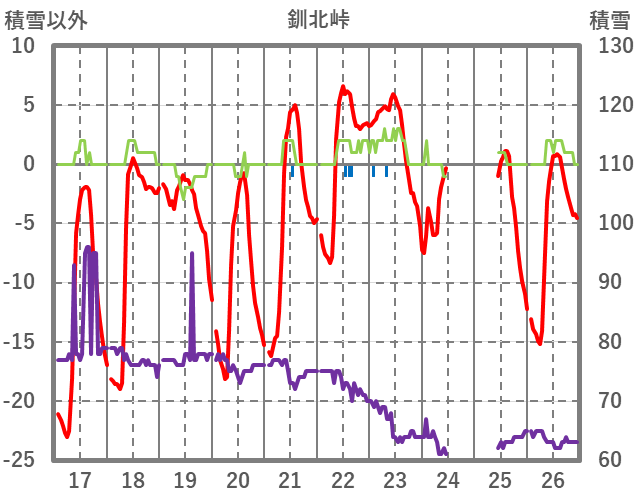| 日 | 時 | 気温 | 降水 | 風向/風速 | 日照 | 積雪 | 降雪 |