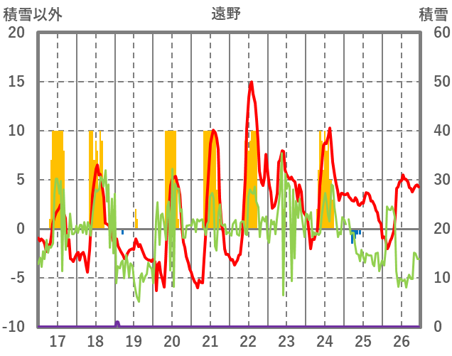 | 日 | 時 | 気温 | 降水 | 風向/風速 | 日照 | 積雪 | 降雪 |