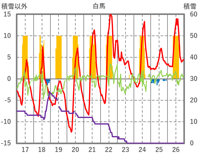 | 日 | 時 | 気温 | 降水 | 風向/風速 | 日照 | 積雪 | 降雪 |