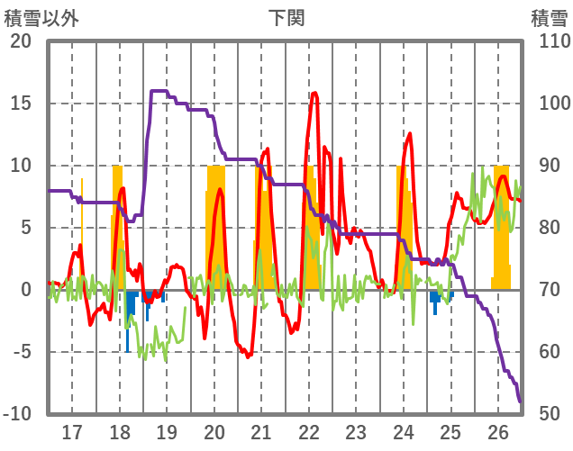 | 日 | 時 | 気温 | 降水 | 風向/風速 | 日照 | 積雪 | 降雪 |