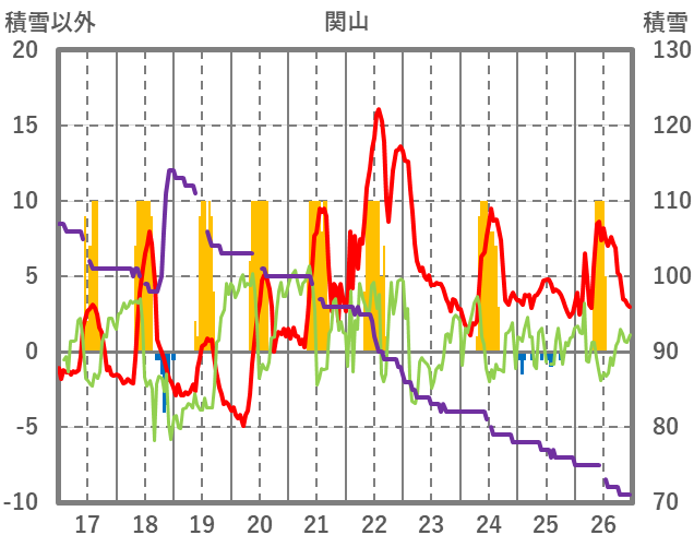 | 日 | 時 | 気温 | 降水 | 風向/風速 | 日照 | 積雪 | 降雪 |