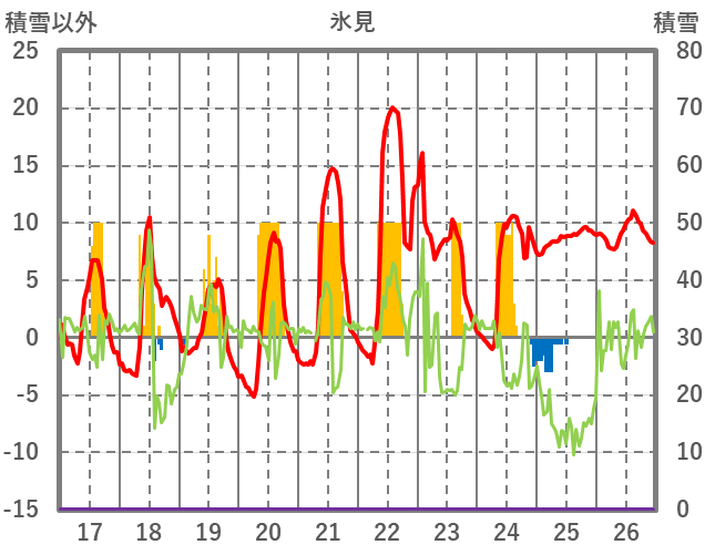 | 日 | 時 | 気温 | 降水 | 風向/風速 | 日照 | 積雪 | 降雪 |