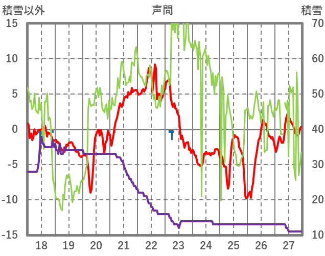 | 日 | 時 | 気温 | 降水 | 風向/風速 | 日照 | 積雪 | 降雪 |