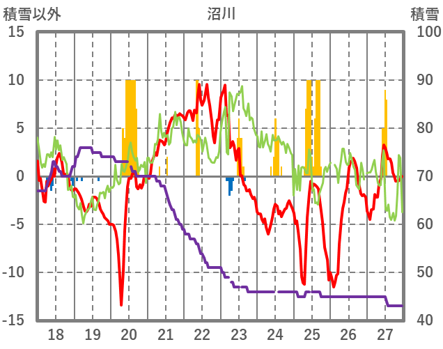 | 日 | 時 | 気温 | 降水 | 風向/風速 | 日照 | 積雪 | 降雪 |