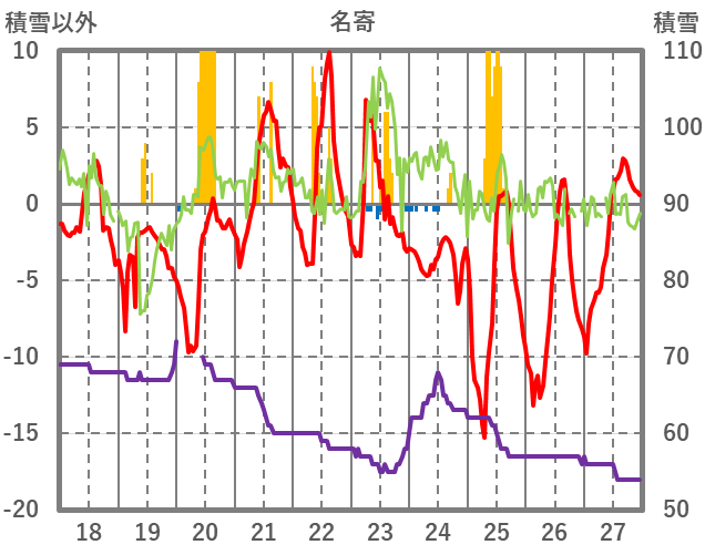 | 日 | 時 | 気温 | 降水 | 風向/風速 | 日照 | 積雪 | 降雪 |