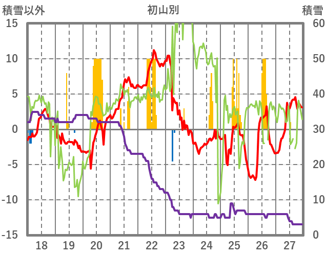 | 日 | 時 | 気温 | 降水 | 風向/風速 | 日照 | 積雪 | 降雪 |