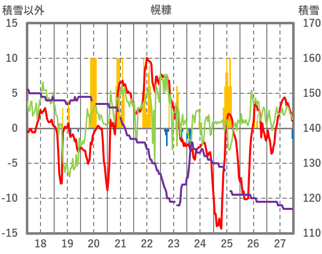 | 日 | 時 | 気温 | 降水 | 風向/風速 | 日照 | 積雪 | 降雪 |