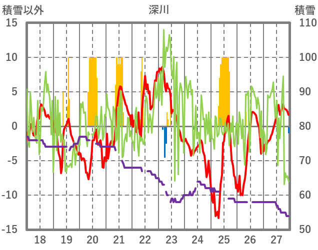 | 日 | 時 | 気温 | 降水 | 風向/風速 | 日照 | 積雪 | 降雪 |