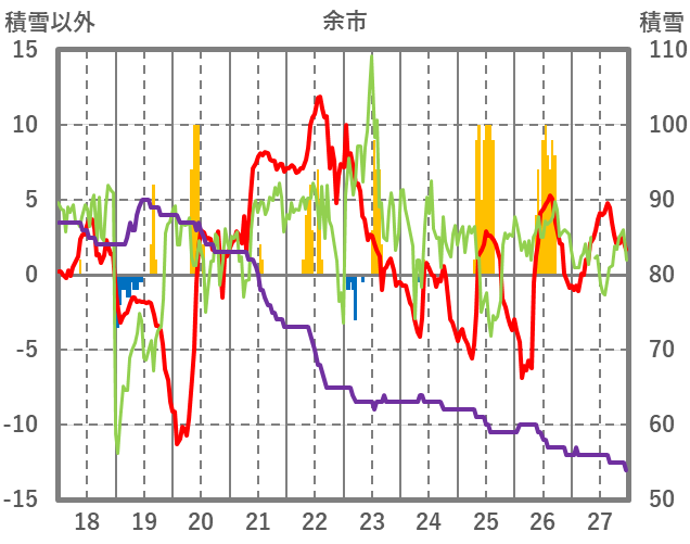| 日 | 時 | 気温 | 降水 | 風向/風速 | 日照 | 積雪 | 降雪 |