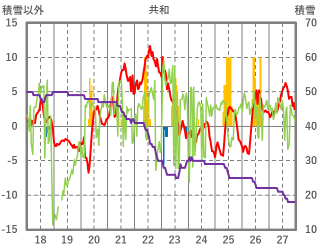 | 日 | 時 | 気温 | 降水 | 風向/風速 | 日照 | 積雪 | 降雪 |