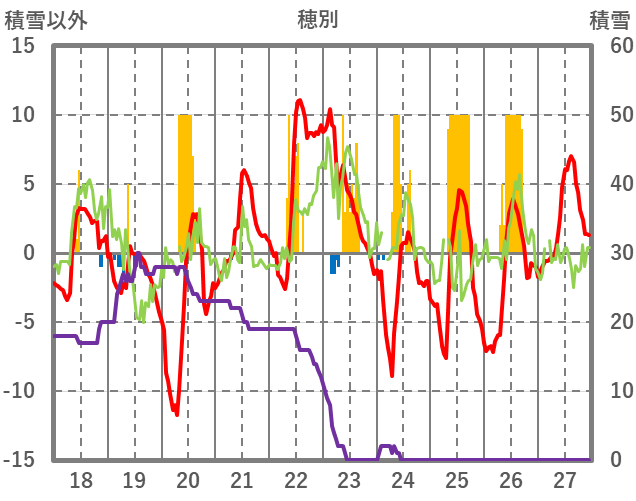 | 日 | 時 | 気温 | 降水 | 風向/風速 | 日照 | 積雪 | 降雪 |