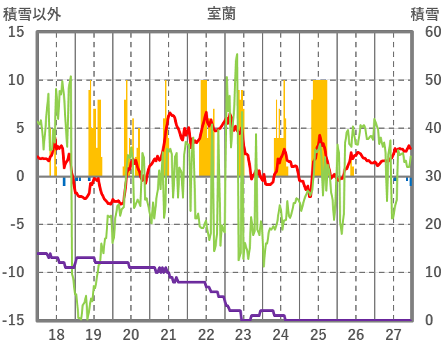 | 日 | 時 | 気温 | 降水 | 風向/風速 | 日照 | 積雪 | 降雪 |