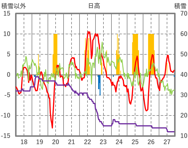 | 日 | 時 | 気温 | 降水 | 風向/風速 | 日照 | 積雪 | 降雪 |