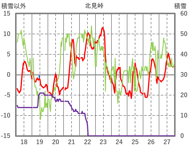 | 日 | 時 | 気温 | 降水 | 風向/風速 | 日照 | 積雪 | 降雪 |